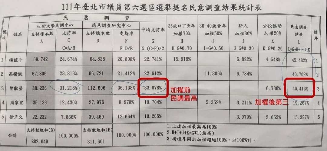 曾獻瑩電話民調33.7%雖最高,但以22.7%居次的楊植斗因新人身分與年紀可加權100%而衝上第一,以22.6%名列第三的高揚凱也靠80%加權逆轉成為第二。原先第一名的曾獻瑩僅有因協助公投而加權20%,反而退居第三,故而地方議論紛紛。(詳見附表)