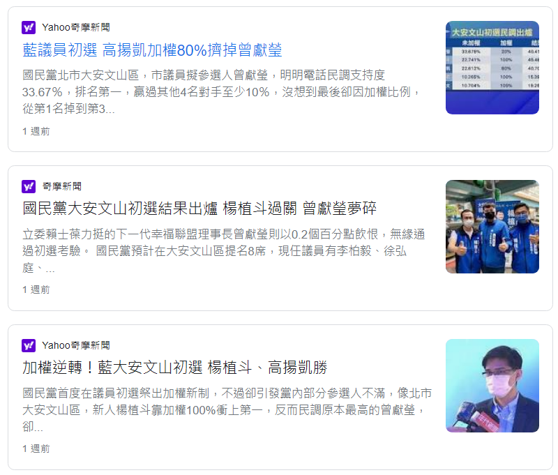 國民黨北市大安文山區,市議員擬參選人曾獻瑩,明明電話民調支持度33.67%,排名第一,遠勝其他4名對手至少10%,沒想到最後卻因特殊的加權比例,從第1名掉到第3名,而原本第3名的高揚凱,反而以0.29%的差距險勝。大安文山區初選雖已確定由楊植斗、高揚凱勝出,但曾獻瑩不甘心,地方支持者也出現了不平聲浪。