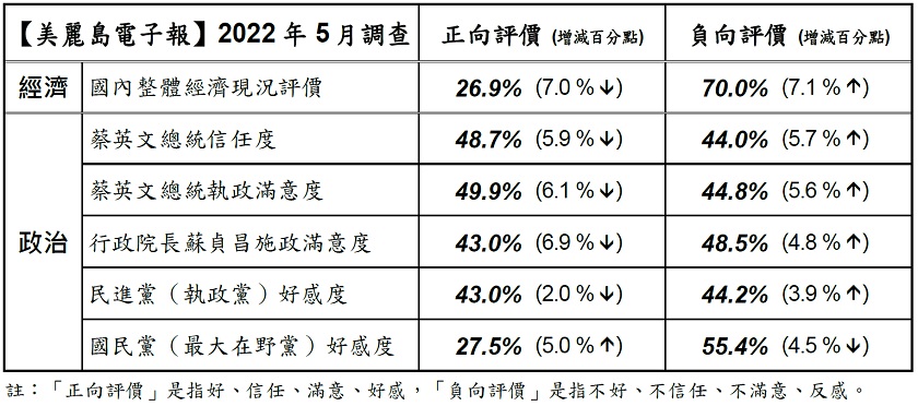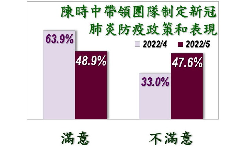 民調摘要:依據《美麗島電子報》5月國政民調,不滿總統蔡英文執政的負面聲浪飆高5.6%來到44.8%;而行政院長蘇貞昌的施政不滿意度,相較上月也升高4.8%,為48.5%。此外,有超過六成民眾認為今年中央政府防疫表現比去年差,且衛福部長陳時中防疫滿意度從4月63.9%跌至5月的48.9%,其中台北市民對他的滿意度暴跌21%,成為全台最不滿陳時中之地。