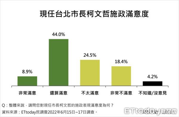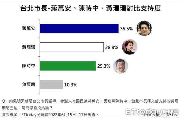 據《東森新媒體ETtoday》最新民調示,年底台北市長大選若由國民黨立委蔣萬安與民進黨衛福部長陳時中﹑台北市副市長黃珊珊競逐,蔣萬安支持度35.5%領先,黃珊珊以28.8%居次,陳時中則是25.3%最末,而這也是黃珊珊首次超車陳時中。此外,該調查也指出,台北市民對於即將在年底卸任的柯文哲市長施政滿意度有過半,為52.9%(包含非常滿意8.9%、還算滿意44.0%);另有42.9%台北市民表示不滿意(包含非常不滿意18.4%、不太滿意24.5%)。