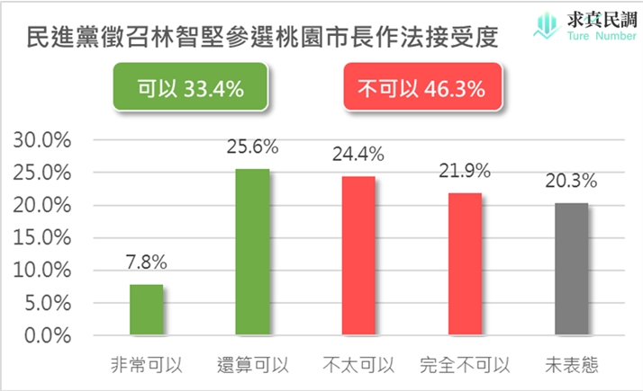 民調摘要:相關報導說明,民進黨桃園市長參選人、現任新竹市長林智堅表示,內部民調顯示民眾不覺得到桃園是空降,也不認同落跑的看法;民眾黨桃園市長參選人、立委賴香伶則曝光求真民調報告,其結果顯示,對於林智堅是否應先完成新竹市長的任期,再轉做其他政治職務,有29.8%市民認為非常應該、29.8%還算應該、15.0%不太應該、1.7%非常不應該,另有23.7%未表態。整體而言,高達59.6%、約6成桃園市民認為「林智堅應該完成新竹市長任期再做其他政治職務」,只有16.7%者認為「不應該」(圖一所示)。另外對於民進黨決定提名任期尚未結束的現任新竹市長林智堅選桃園市長,有高達46.3%的桃園市民表示沒辦法接受,比可以接受的33.4%,高出約13個百分點。其中有7.8%的民眾認為非常可以、25.6%還算可以、24.4%不太可以、21.9%完全不可以,另有20.3%未表態(圖二所示)。該調查以「電腦輔助電話訪問」系統(Computer Assisted Telephone Interviewing,CATI)進行訪問,事後再以「多變量反覆加權(raking)」方式,針對性別、年齡、教育程度、設籍行政區等四個變項進行加權處理,使樣本結構特性與母體相符。