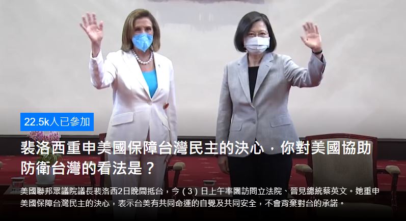 民調主題:裴洛西重申美國保障台灣民主的決心,你對美國協助防衛台灣的看法是?