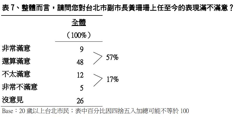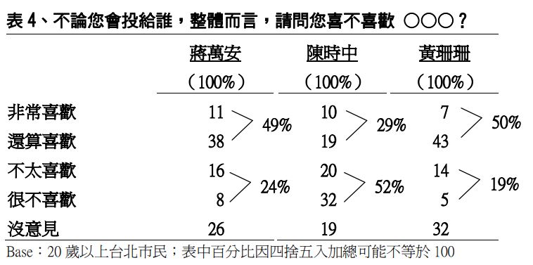 一、台北市長選戰藍、綠、白三強鼎立戰局確立,在此民調中,黃珊珊的喜好度、任內職務滿意度皆為三位參選人中最高,支持度卻不是最高的可能原因?
