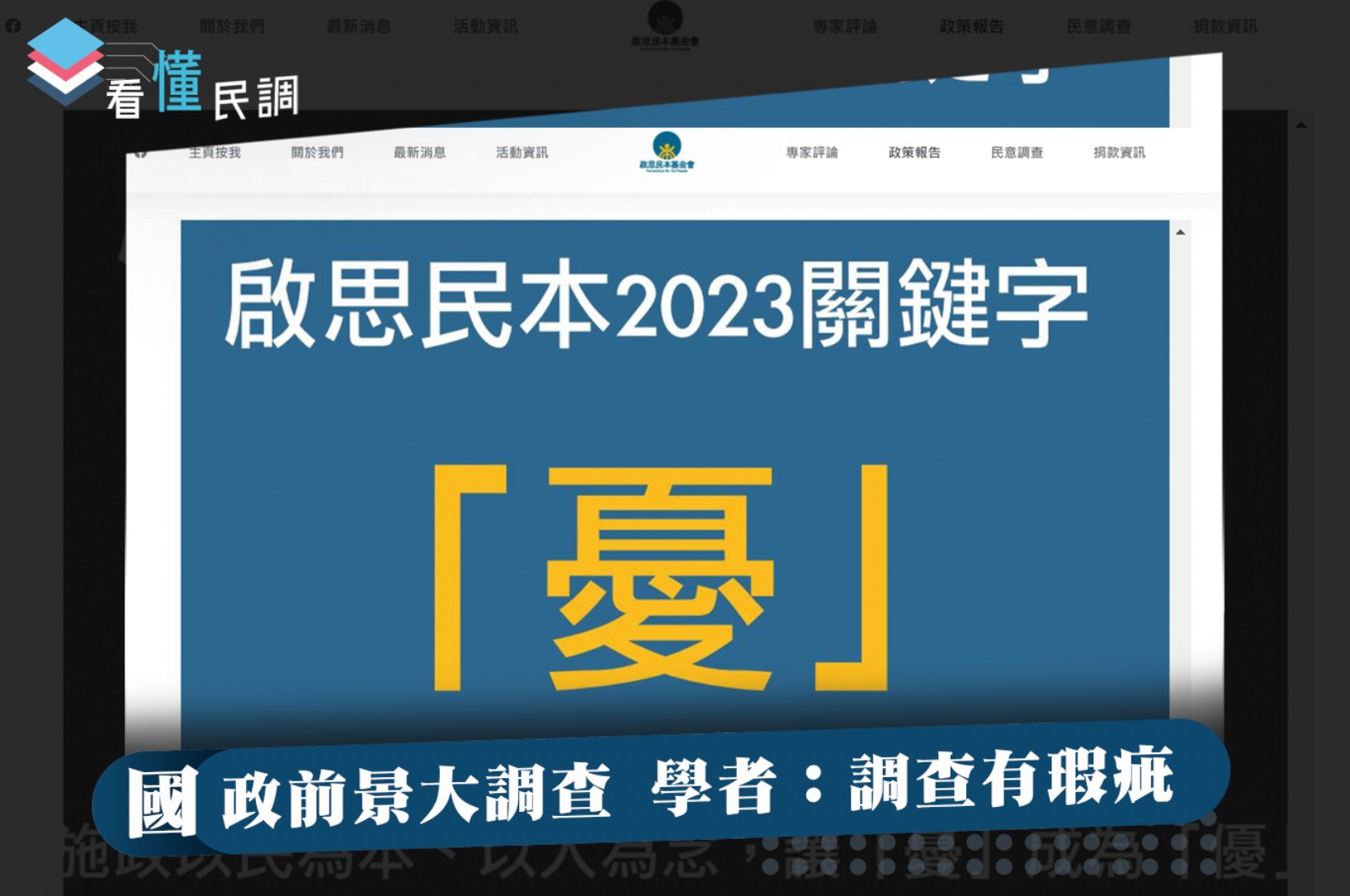 民調摘要:啟思民本基金會在2022年10月31日發布2023國政前景大調查,該民調由啟思民本基金會於10月25日至10月27日,以臉書廣告發放問卷方式針對20歲以上之網路人口,嚴守配額原則,配額標準為性別、年齡、地區,有效樣本為1070份,抽樣誤差在95%信心水準下為正負3.0%內。採用比例估計法,母群體參數依內政部2022年6月之人口數據,針對本次調查蒐集資料,以反覆加權法(Raking)進行逐項重複連續性修正,使樣本的性別、年齡、地區特徵符合全國母體結構。此民調為國內首次由民眾針對明年國政前景進行評估,包含治理、兩岸、外交、經濟、民主、民生等方向,以0至10分來檢測民眾的悲/樂觀程度。整體總平均僅3.74,顯示臺灣民眾對於臺灣2023年的國政前景發展是「前景堪『憂』」,瀰漫著一股不安與失望的氣氛,值得執政的民進黨以及各個在野黨警惕。