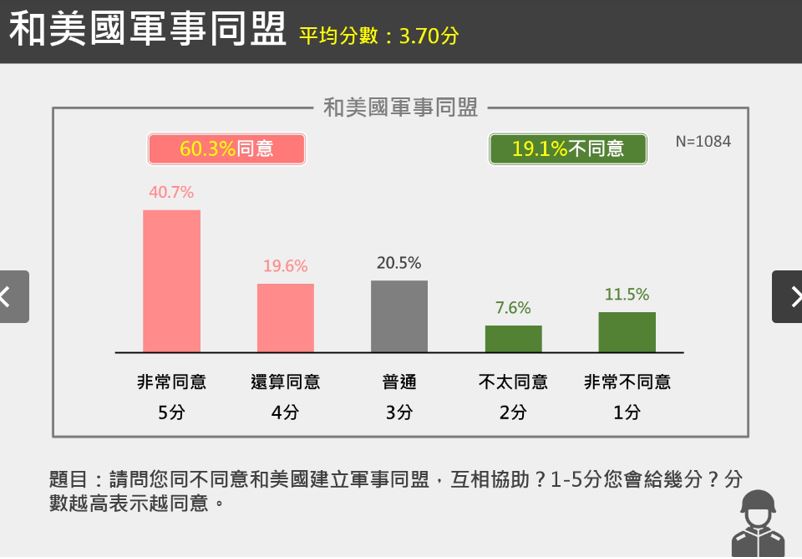 至於所謂「台灣人民不想與美國建交卻想要軍事同盟」之說,是來自前者3.54分,後者3.70分(圖一、二所示)。就「分析方法」觀察,1084這麼小的「非隨機樣本」,加上題目的混淆形象性,其間 0.16 的微小差距,其實是不顯著的、即就統計專業,可能是相同或無意義的。