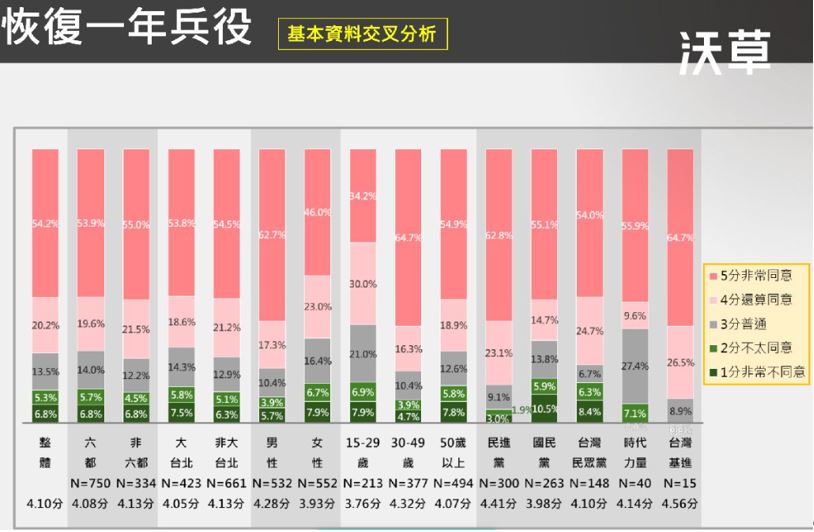 本題最淺顯的反映就是:在15種不同分類中,對這題支持度最低的是「15-29歲」群(圖三所示)。這是兵役恢復會影響的當事人,也是萬一發生戰爭最會被犧牲的人。這個最淺顯的人性,可能是此非常複雜的調查案中,唯一最清楚的答案。