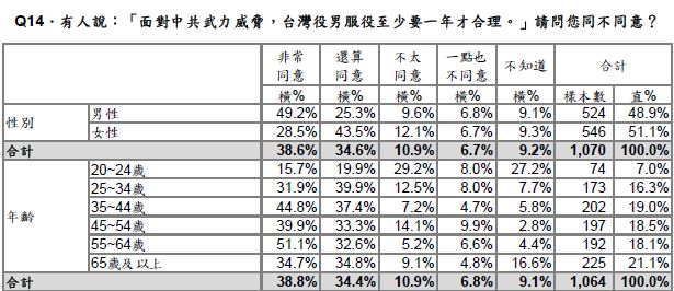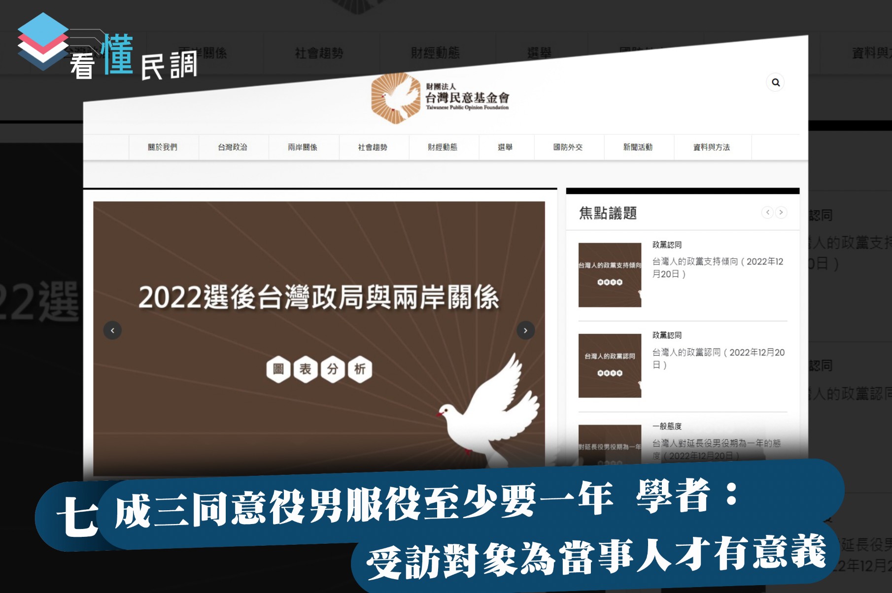經檢視此民調,調查方法與內容尚屬嚴謹,不過在圖表文字上有出現錯誤,建議更正。此調查也詢問了台灣人對「兵役制度」的態度,高達七成三同意役男服役至少要一年,不過該調查詢問對象為20歲以上成年人,從交叉分析表可以發現,55~64歲的民眾認為非常同意占了51.1%,且包含女性民眾,雖符合「全國性民調」精神,不過當事人意願最重要,故「兵役制度」的題目應採納18歲以上還沒當過兵的役男為主要目標對象,才有意義。