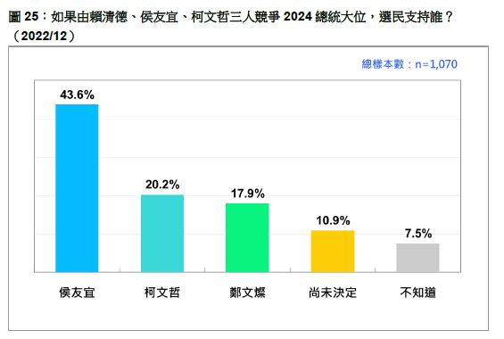 經檢視此民調,調查方法與內容尚屬嚴謹,不過在詢問「國人對四位2024可能總統候選人的感覺」這題,列舉的人物為國民黨主席朱立倫、副總統賴清德、(前)台北市長柯文哲、新北市長侯友宜,但在後續詢問「總統大選分組競爭支持度」時,拿掉感情溫度排行低於侯友宜的朱立倫,加入了未測量感情溫度的鄭文燦與柯文哲、侯友宜共同競爭,且在圖表文字上,出現賴清德未替換成鄭文燦的錯誤(圖一所示),建議更正。