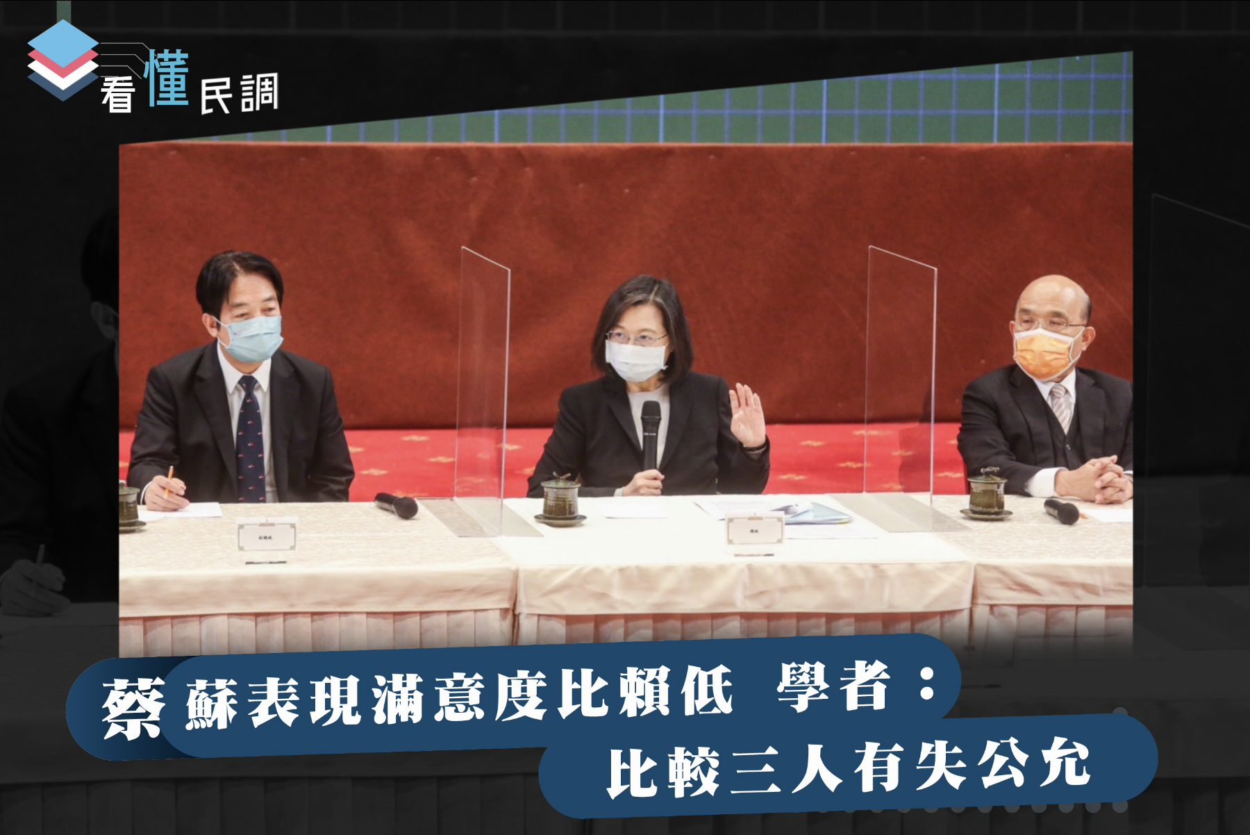 此調查結果中,蔡英文總統與行政院長蘇貞昌的不滿意度皆高於滿意度,這與九合一選舉帶給民進黨的挫敗有關,民調易受當下時空背影影響,而副總統賴清德則是滿意度高於不滿意度,此現象可能與副總統是備位元首,在政務方面並沒有實際權力,所以詢問賴清德滿意度,所呈現的比較偏向個人特質與形象。若將其三人放在一起比,並不完全公允。