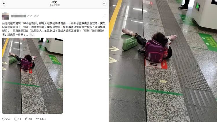 近日,Threads 上流傳一則貼文,聲稱在台北捷運月台目睹一名國小生昏倒,現場卻無人上前協助,並警告這是詐騙集團的新手法。