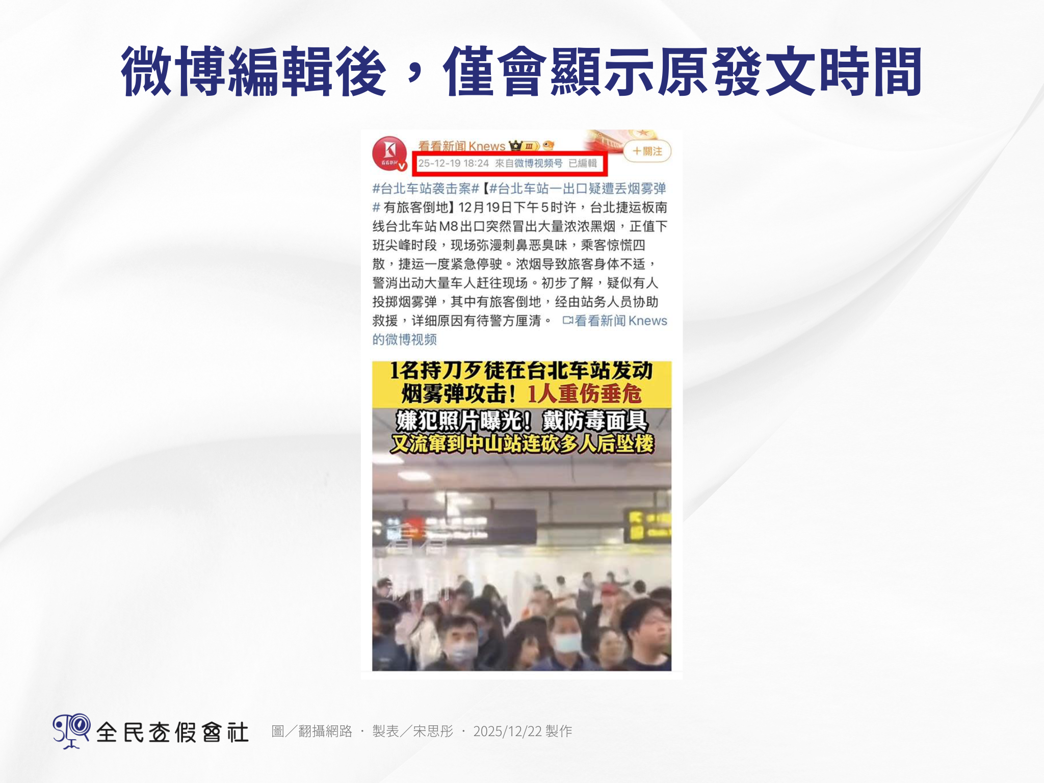 《全民查假會社》循線找到該網友指涉的媒體「看看新聞」,在微博確實可發現 18:24 的貼文,就已經發佈墜樓訊息,但在時間處旁邊則有「已編輯」字樣。