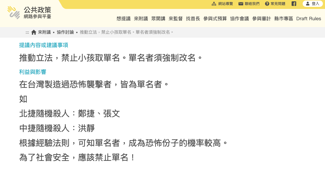 ▲ 有網友提案禁止取單名。(圖/翻攝公共政策網路討論平臺)