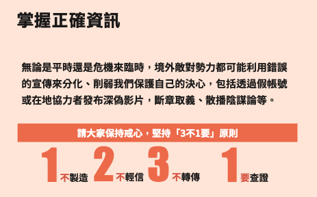 ▲ 面對未經證實消息時,應保持 3 不 1 要原則。(圖/翻攝《臺灣全民安全指引》)