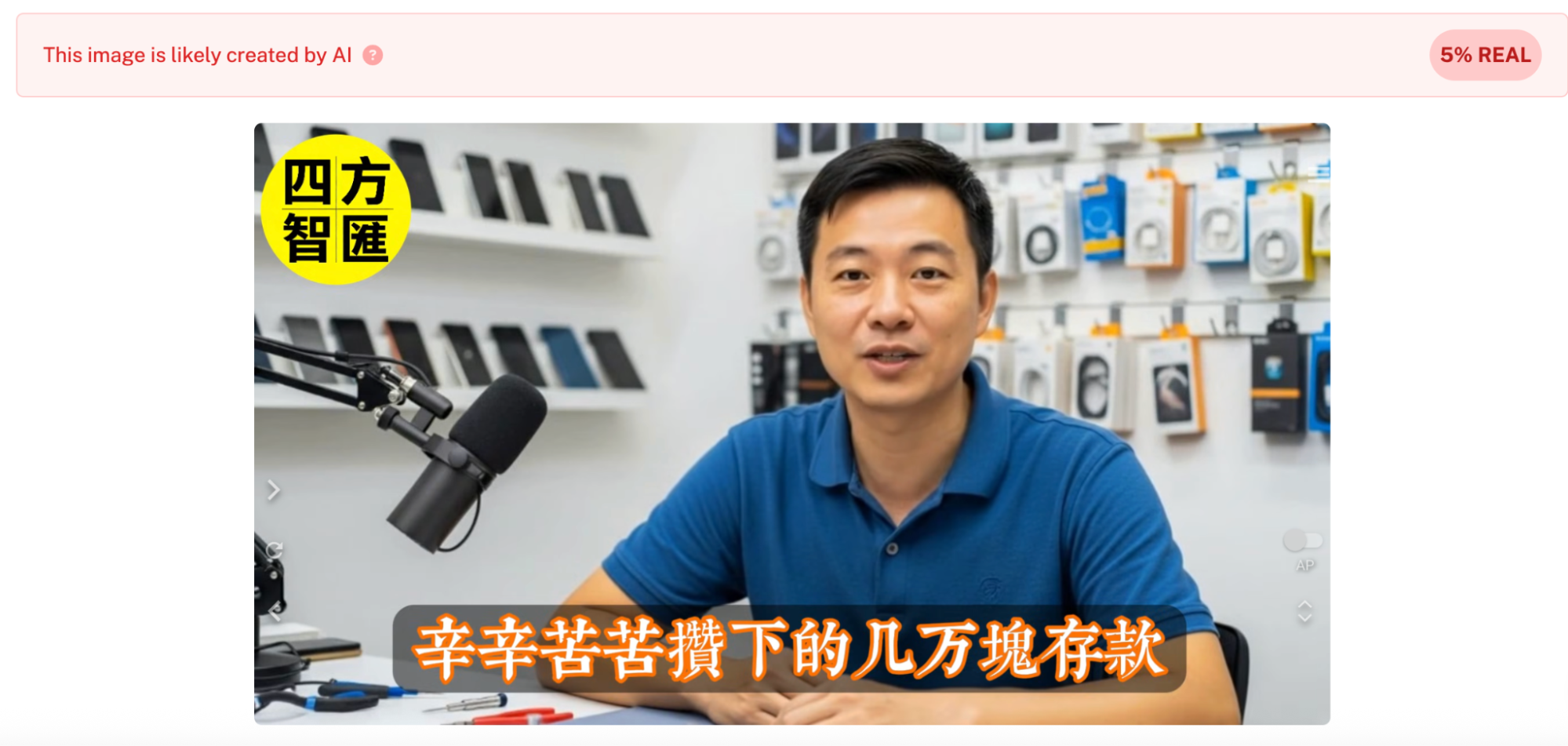 這則影片出自名為「四方智匯」的 YouTube 頻道,後續也被轉發至 Facebook 上流傳。此影片在 YouTube 上被標記為「變造或合成的內容」,且影片人物說話的畫面和聲音相當不自然,極可能為 AI 生成影片,內容可信度較低。