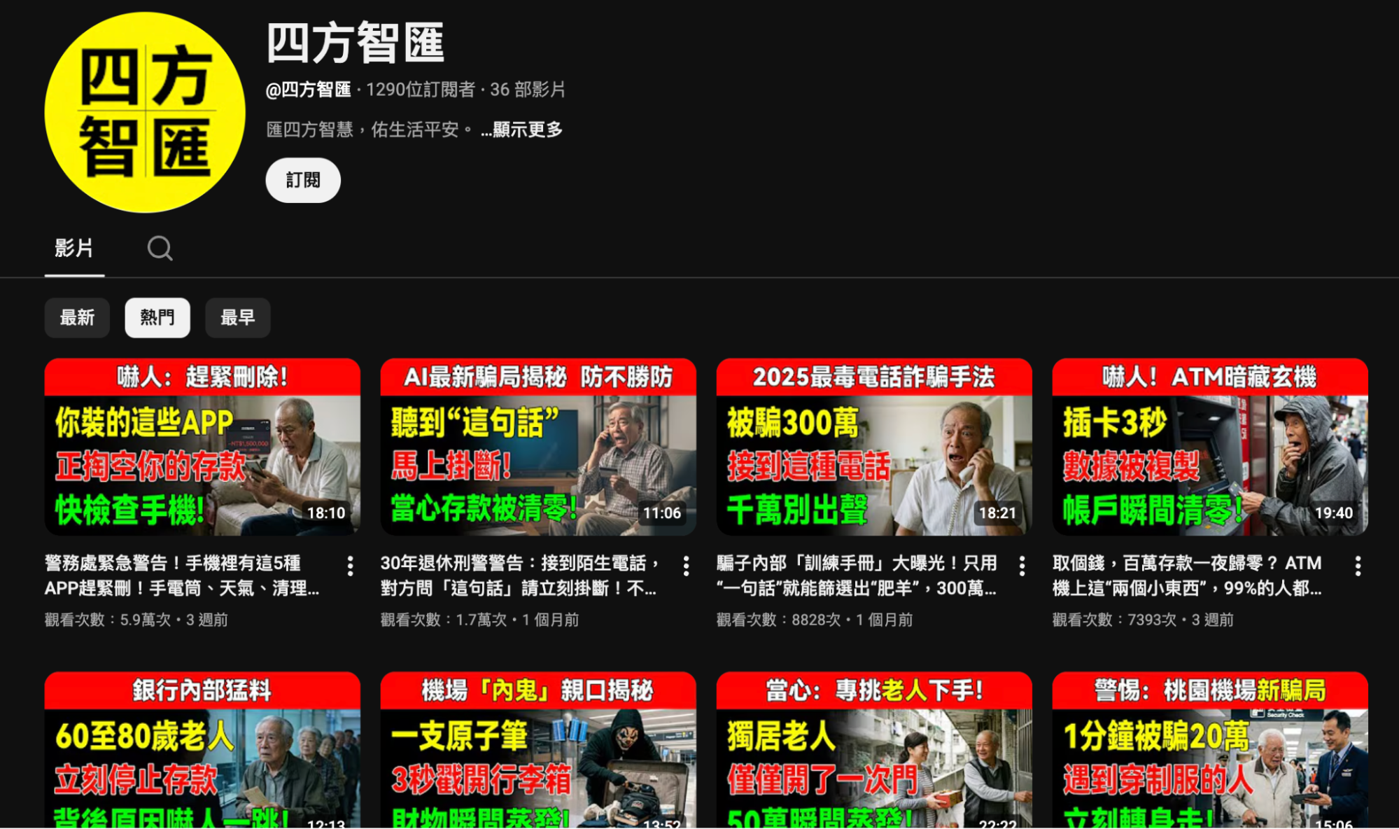 ▲ YouTube 頻道「四方智匯」上傳的影片多為詐騙相關主題,但皆為 AI 生成影片。(圖/翻攝網路)