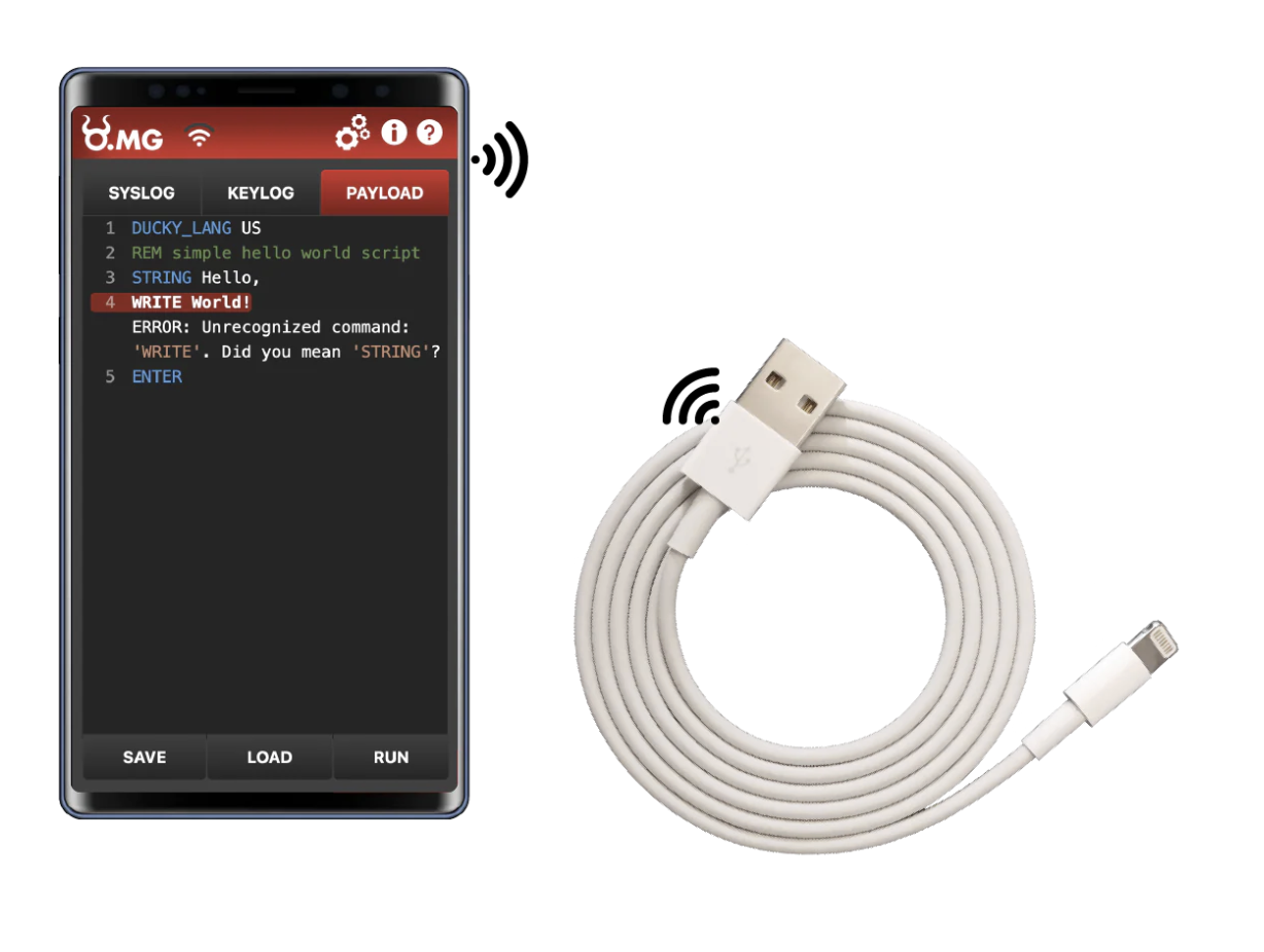 此類攻擊技術的代表為 O.MG 木馬傳輸線(O.MG Cable;俗稱駭客連接線),其外觀長得與一般充電線無異,但內部搭載了一個特製「駭客晶片」,攻擊者只要透過 Wi-fi 無線網路技術,就能遠端執行內部腳本,進而控制使用者手機。