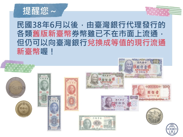 ▲ 停止流通的舊版新臺幣,仍可持向臺灣銀行各營業單位,兌換等值的現行流通券幣。(圖/翻攝中央銀行臉書)