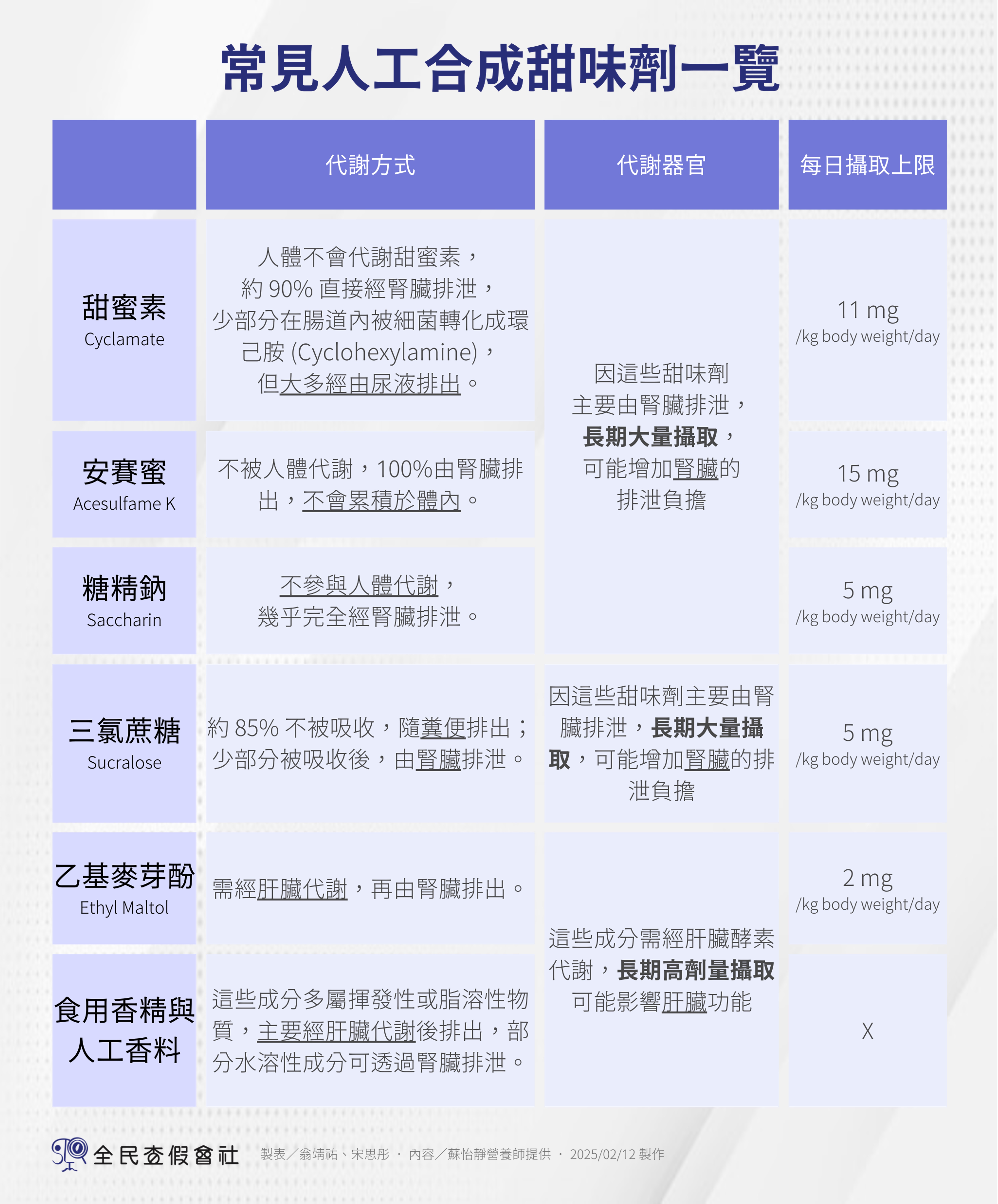 ▲ 常見人工合成甜味劑、食用香精與人工香料代謝方式與每日可接受攝取量。(表/蘇怡靜營養師提供)