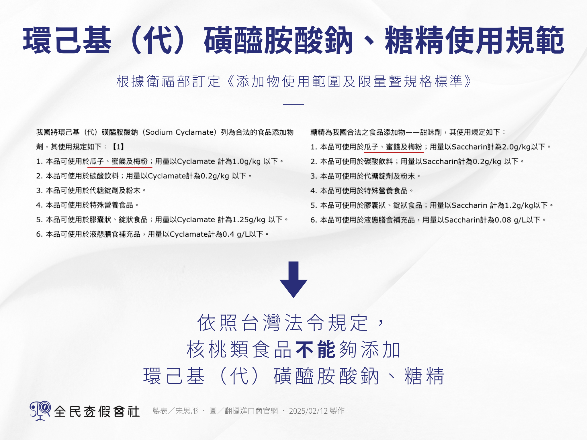 根據網站資訊指出,該款核桃的不合格原因為:被檢驗出甜味劑糖精 0.03 g/kg,以及環己基(代)磺醯胺酸鈉 0.18 g/kg。查核員實際致電詢問,食藥署表示,不論是甜味劑糖精、或是環己基(代)磺醯胺酸鈉,都只能使用在瓜子、蜜餞或梅粉,並不能用在核桃上。