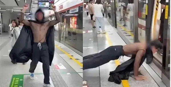 ▲ 今年八月中旬,杭州地鐵9號線客運中心地鐵站有名男子身穿黑色絲襪材質上衣與黑色斗篷,爬行進入列車。(圖/微博)