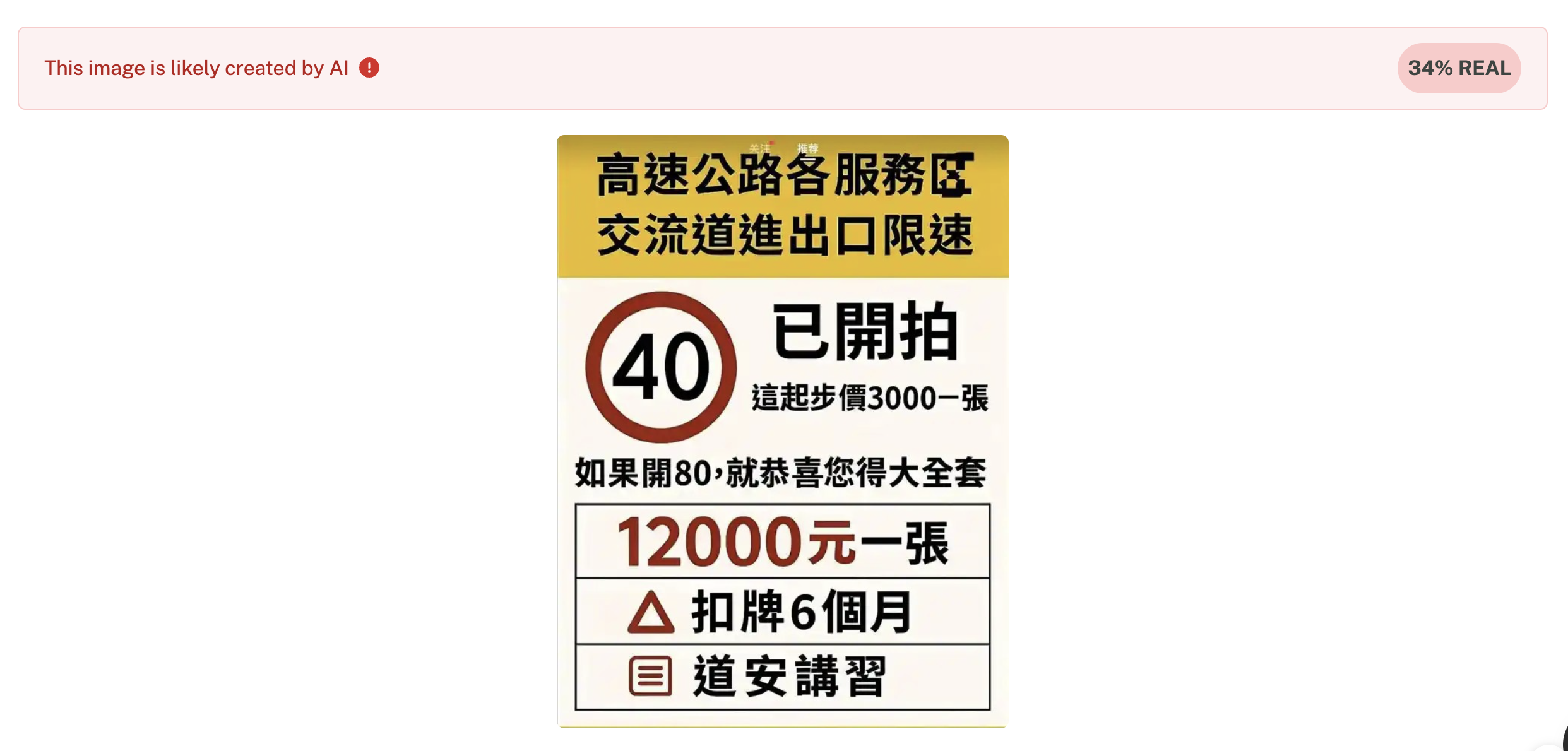 誇大訊息。實際僅有南投服務區部分路段短期執行測速取締,並未全面性設立測速相機,也無全台通案的「限速 40/起罰 3,000/最高 12,000」罰則。網傳圖卡中的「扣牌 6 個月」、「全省都有」等內容均為錯誤資訊。此外,圖卡極可能為 AI 生成,從排版、字體到細節呈現均出現破綻。