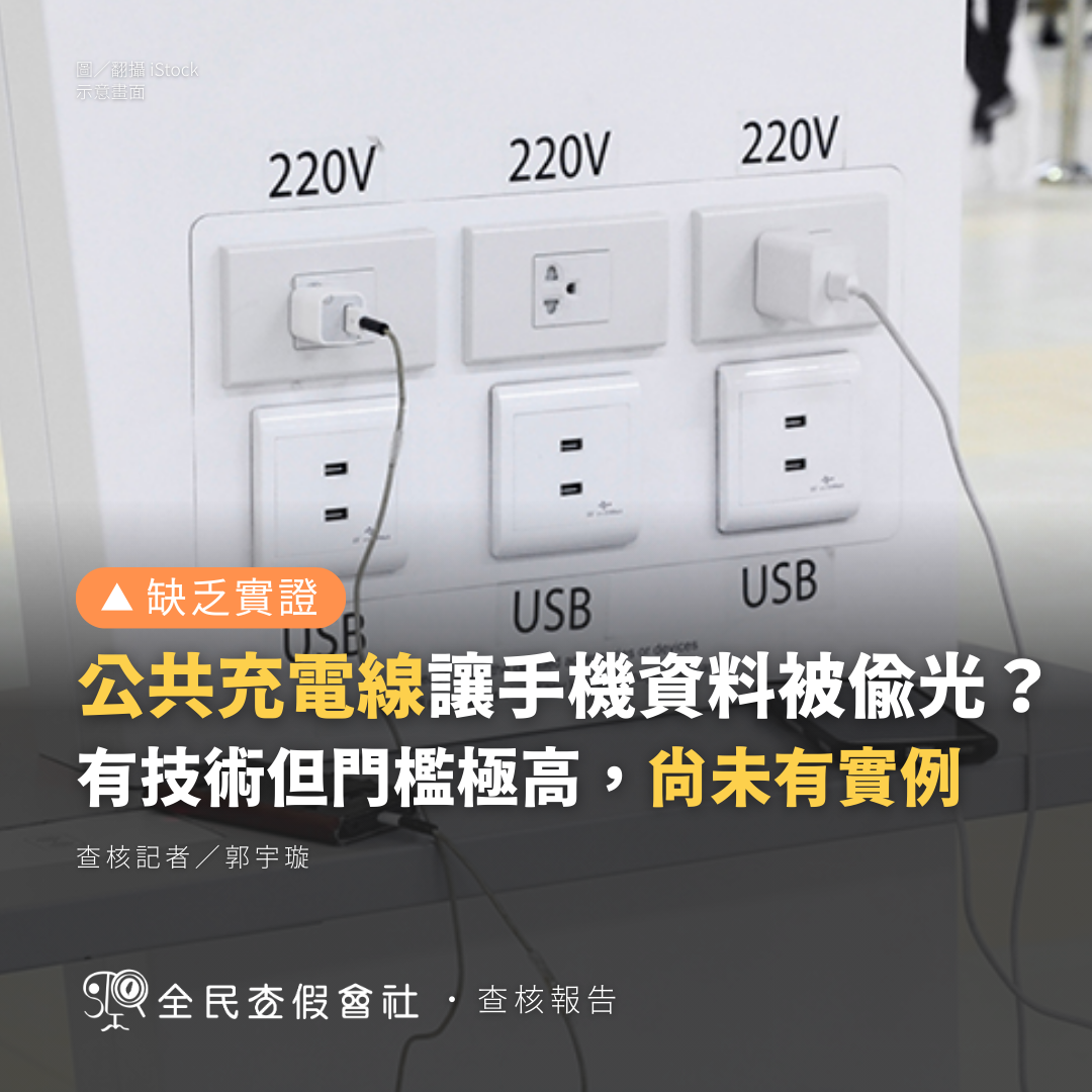 誇大且缺乏實例的資訊,「因充電而金錢遭竊」技術上確實有可能做到,但發生的機會極低,目前國內外尚未發生實際案例。