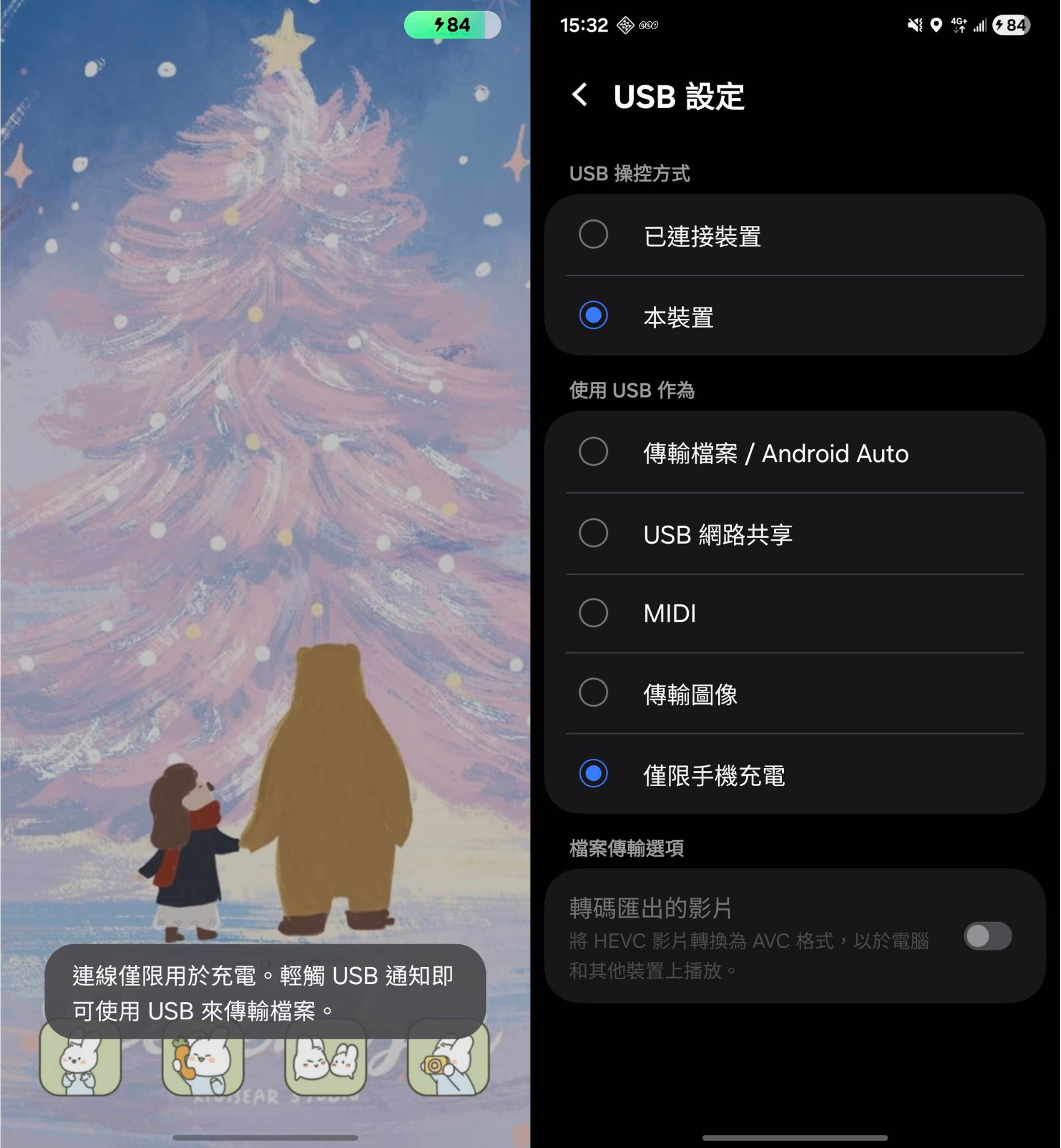 ▲ Android 手機連接外部裝置時,會出現 USB 設定相關通知。(圖/郭宇璇提供;型號 Samsung A54)