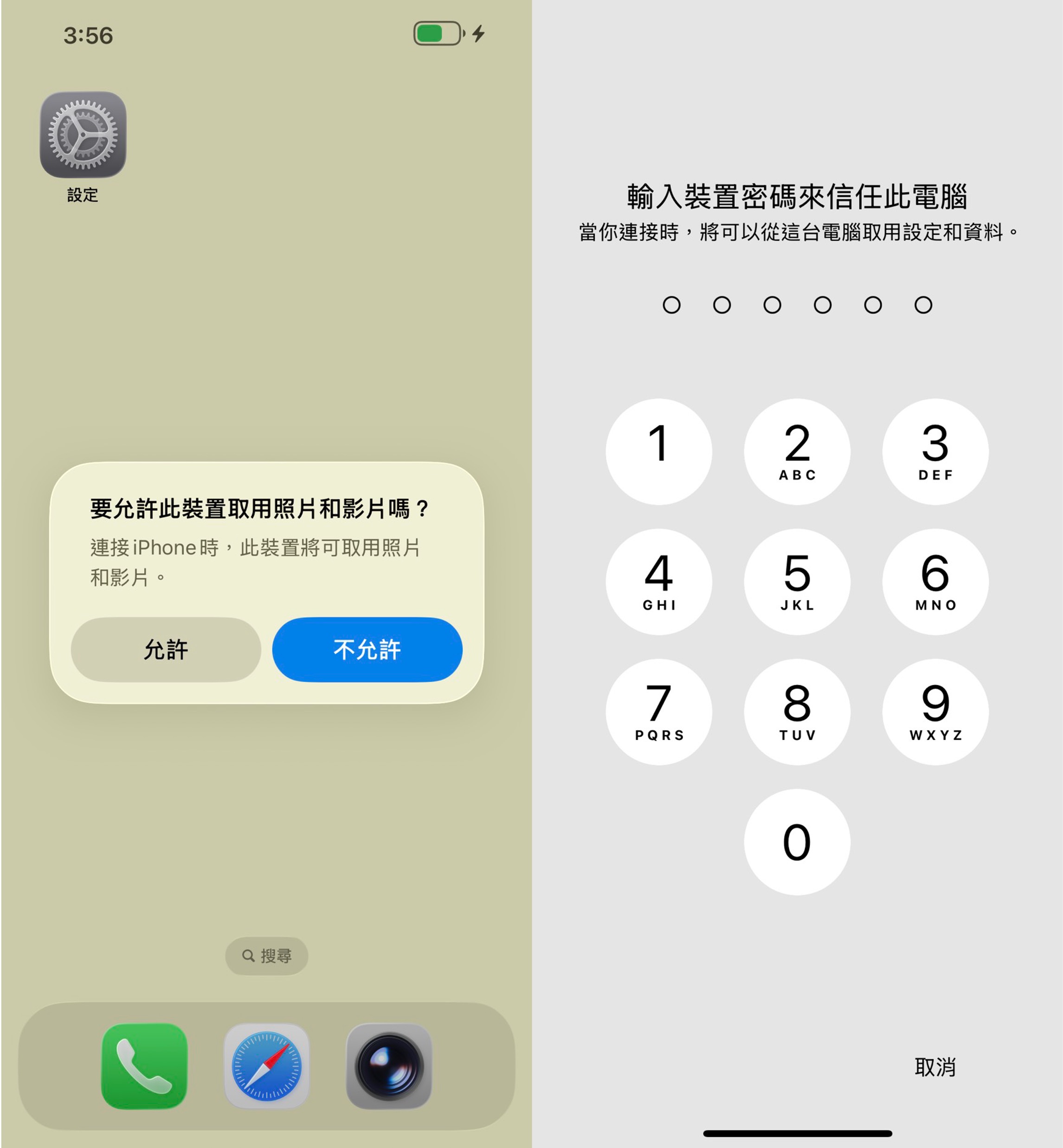 ▲ iPhone 手機連接外部裝置時,若點選允許裝置取用資料,則需輸入手機密碼。(圖/郭宇璇提供;型號 iPhone 13)