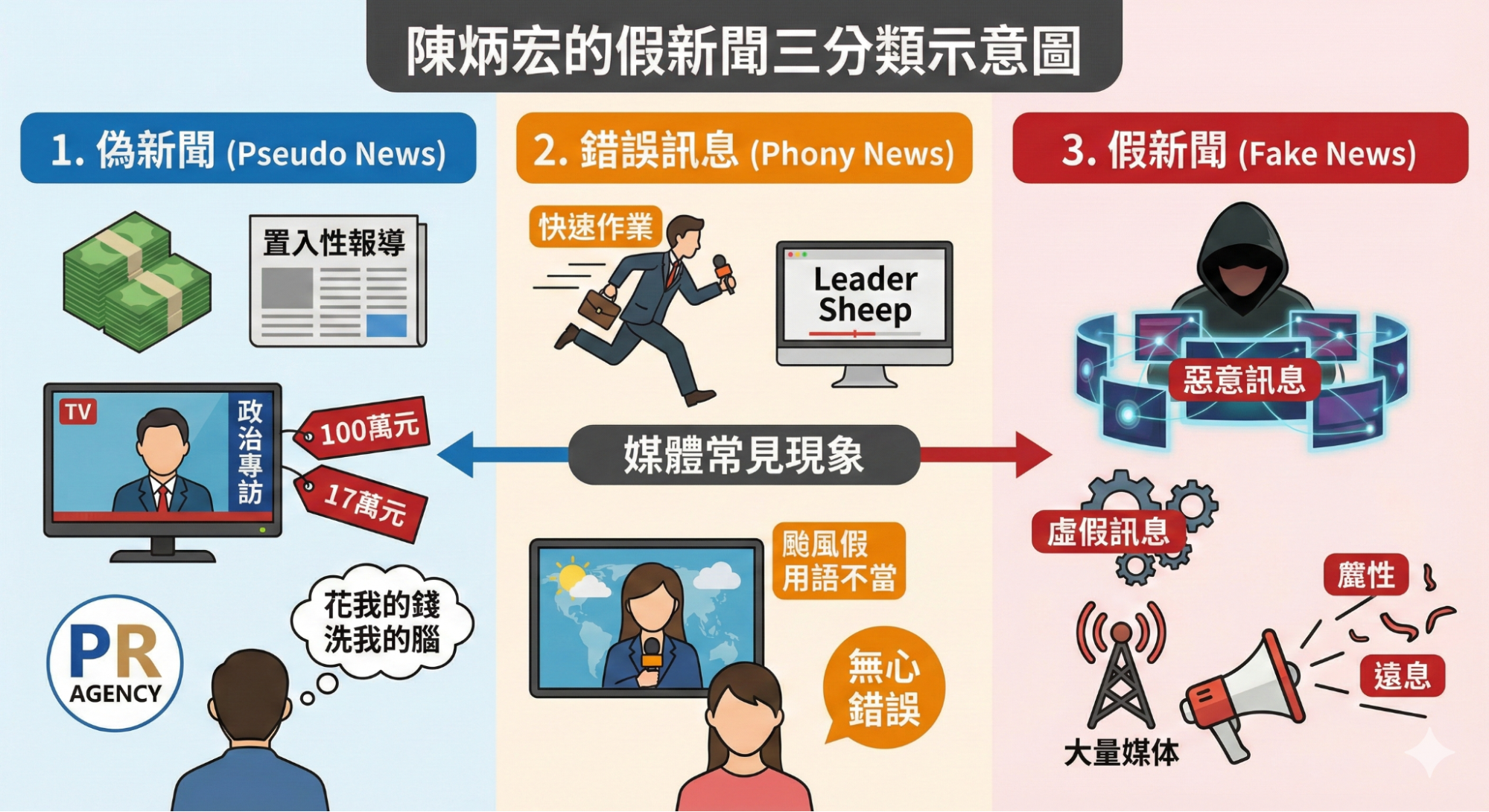 ▲ 陳炳宏將假新聞分成三類,並舉出 2024 年總統大選案例。(圖/AI 協作,經責任編輯審核)