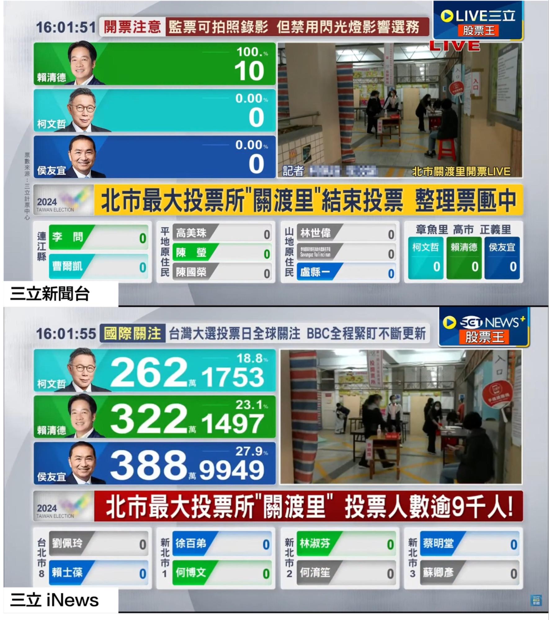 ▲ 三立新聞、三立 iNews 台在 2024 年總統大選開票時畫面。(圖/翻攝三立電視,責任編輯組圖、上字)