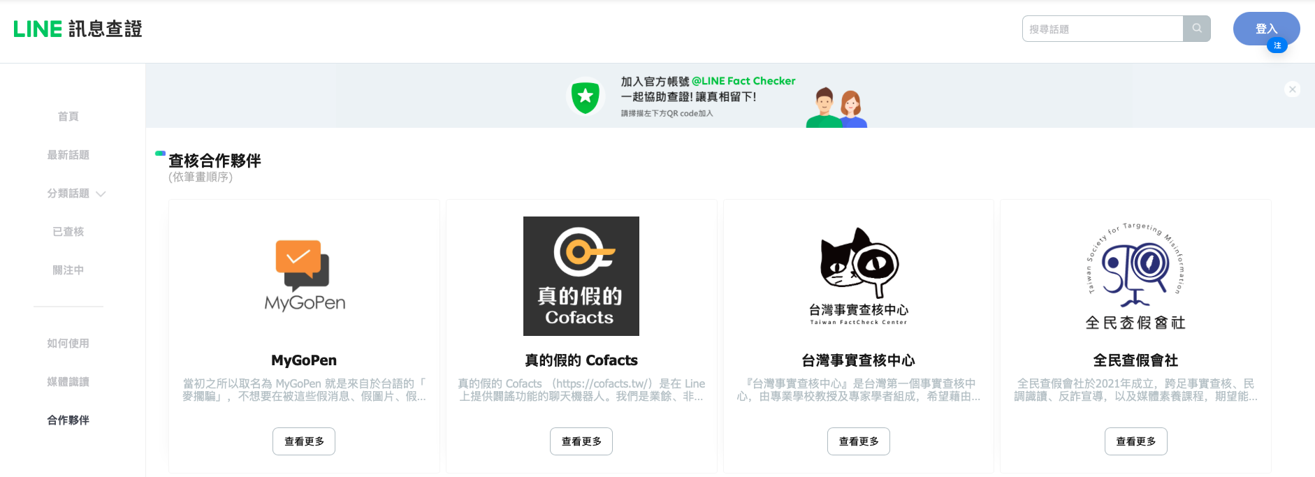 ▲ LINE 在查核領域上的合作夥伴,包含去年 8 月通過國際認證的《全民查假會社》。(圖/翻攝 LINE 訊息查證)