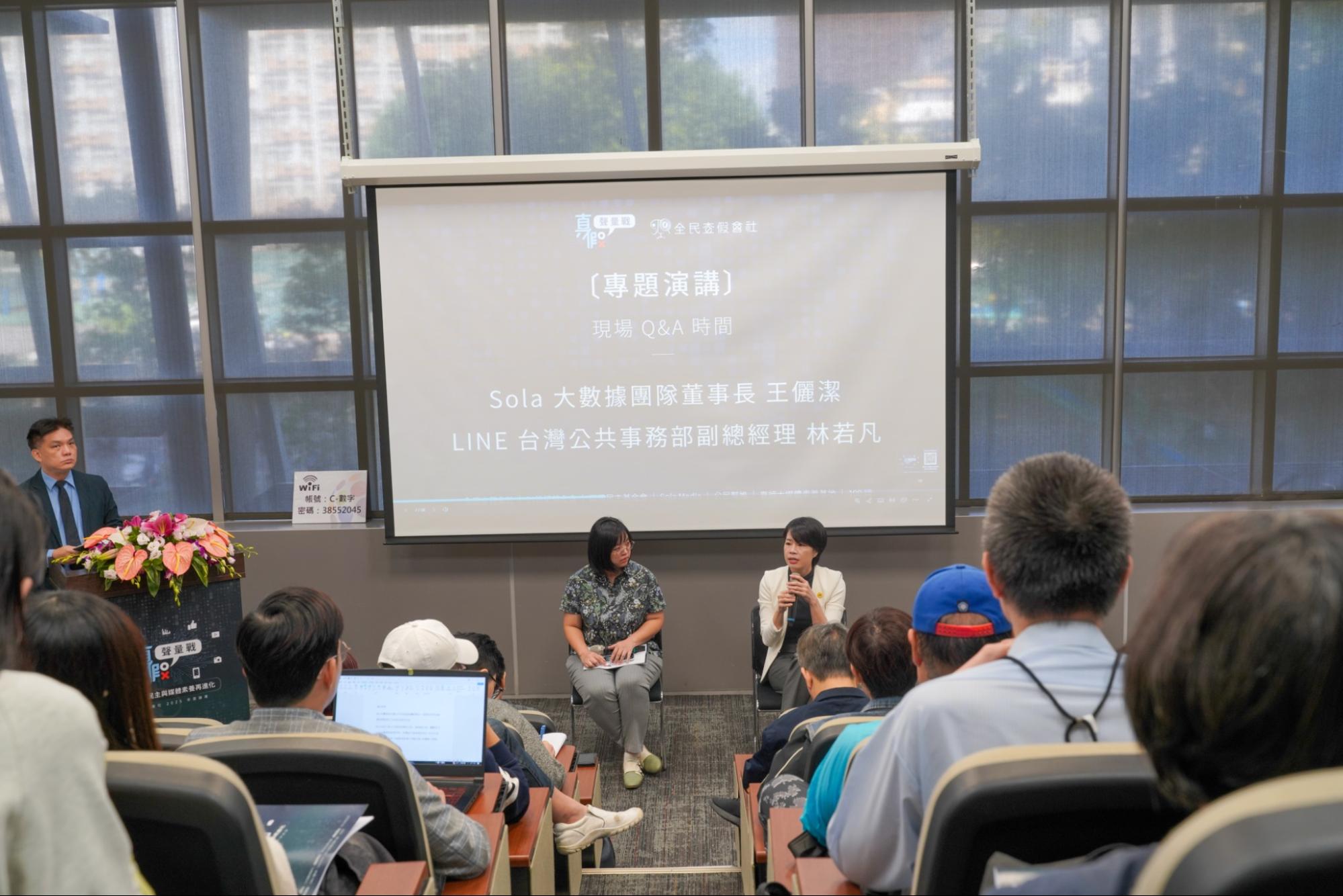 ▲林若凡(右起)與 Sola 大數據董事長王儷潔,在演講結束後共同接受聽眾提問。(圖/全民查假會社提供)