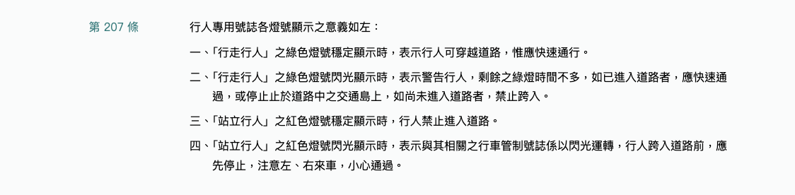 而行人號誌「閃爍」的法律意義,明確規範於《道路交通標誌標線號誌設置規則》第 207 條:「行走行人之綠色燈號閃光顯示時,表示警告行人剩餘之綠燈時間不多;如已進入道路者,應快速通過或停止於道路中之交通島上;如尚未進入道路者,禁止跨入。」