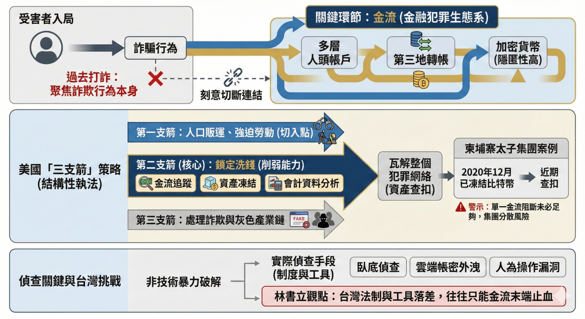 林書立指出,美國近年在處理大型跨國詐騙案件時,並非「先打詐欺」,而是透過一套更具結構性的執法順序,試圖瓦解犯罪網絡。其核心可概括為「三支箭」:第一支箭從人口販運與強迫勞動等犯罪切入;第二支箭則鎖定洗錢行為,透過金流追蹤、資產凍結與會計資料分析,削弱犯罪組織的運作能力;第三隻箭則處理詐欺行為及其背後的灰色產業鏈。