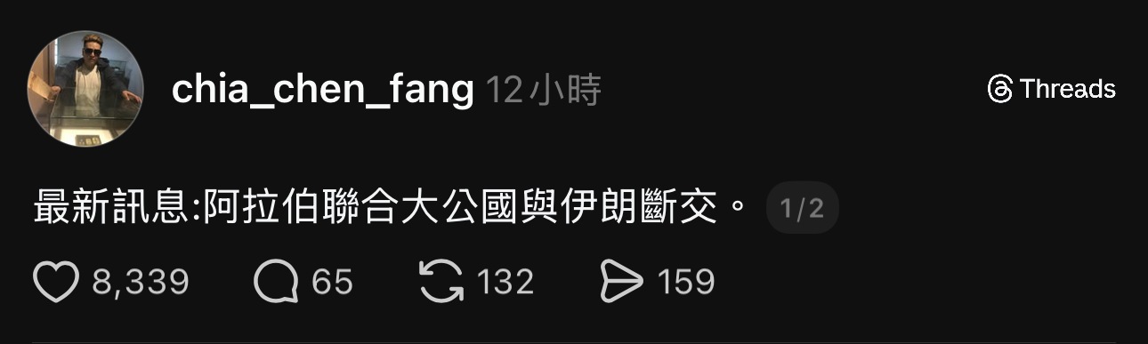 ▲ 網友在 Threads 發文宣稱,阿聯跟伊朗斷交。(圖/翻攝 Threads)