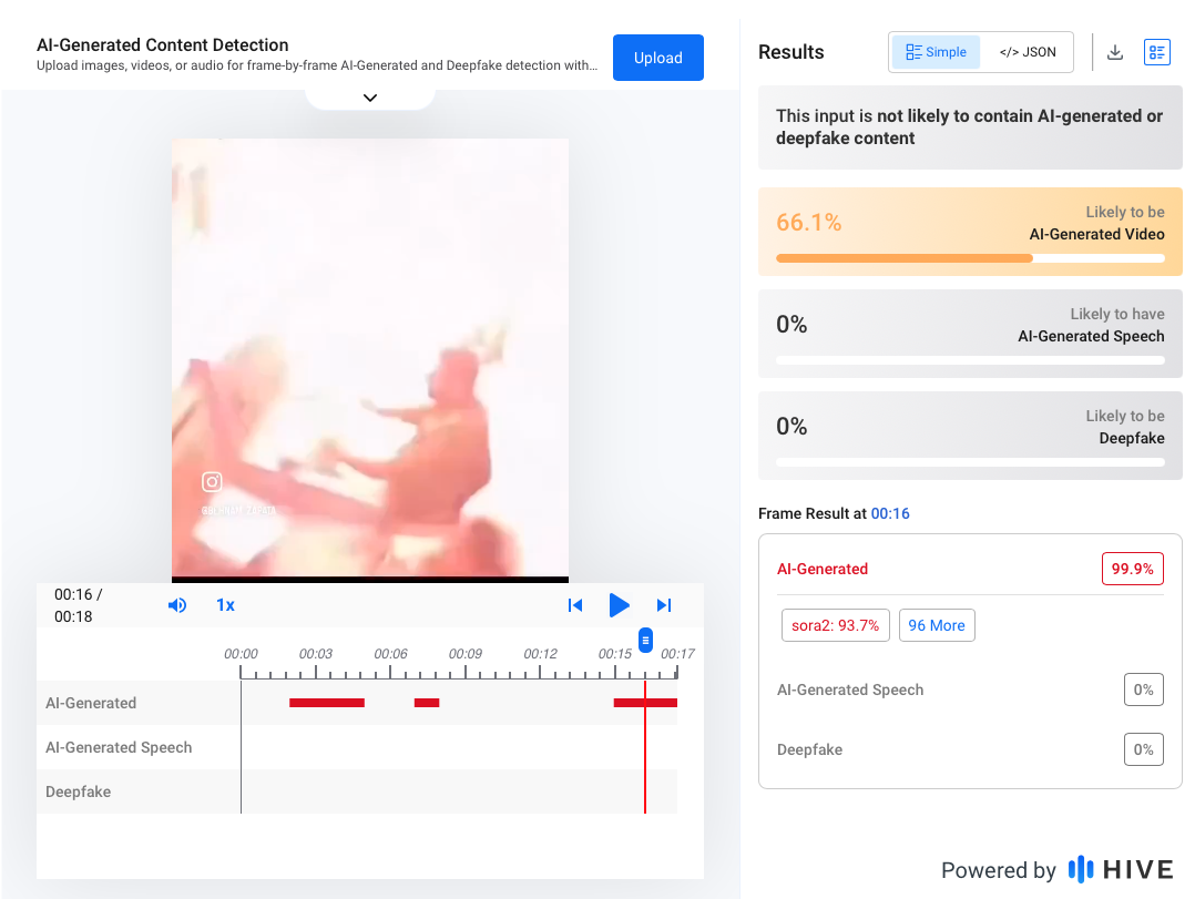 ▲ 經過 AI 工具檢測,最有可能的是利用既有的影片畫面,增加爆炸效果。時間軸顯示,爆炸當下的畫面是由 AI 生成。(圖/翻攝 HIVE AI-Generated Content Detection)