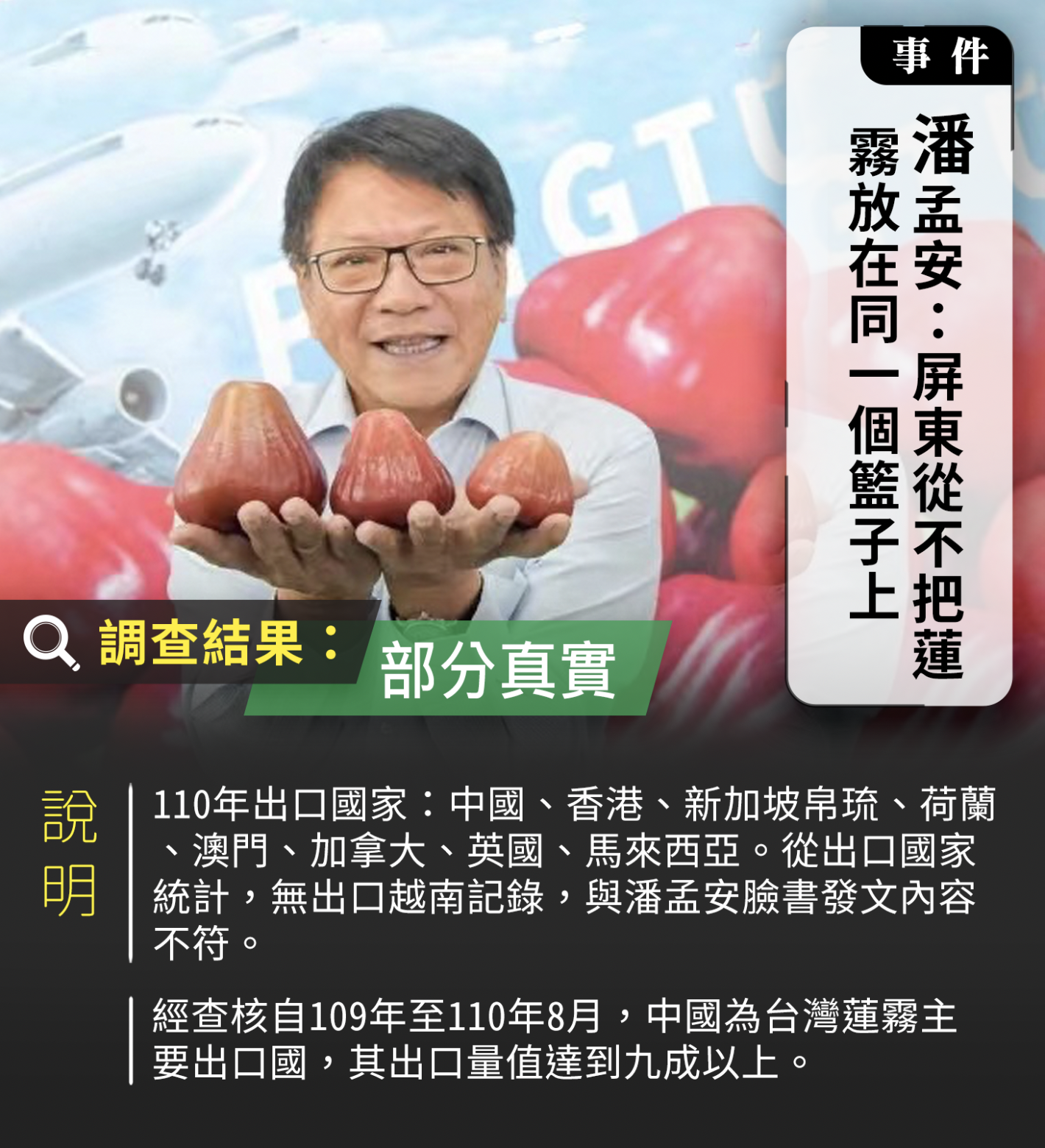 屏東縣縣長潘孟安臉書發文表示,為了避免貿易風險,「屏東從不把蓮霧放在同一個籃子上」,我們在多年前就透過空運,讓蓮霧搭飛機前往加拿大華人超市,同步還有香港、澳門、越南以及新加坡等市場,每年持續分散市場風險。經查核員查核,自109年至110年8月,中國皆為台灣蓮霧主要出口國,其出口量值達到九成以上,且過去幾年並無出口蓮霧至越南市場的記錄。錯誤點一:潘孟安表示,為了避免貿易風險,「屏東從不把蓮霧放在同一個籃子上」。