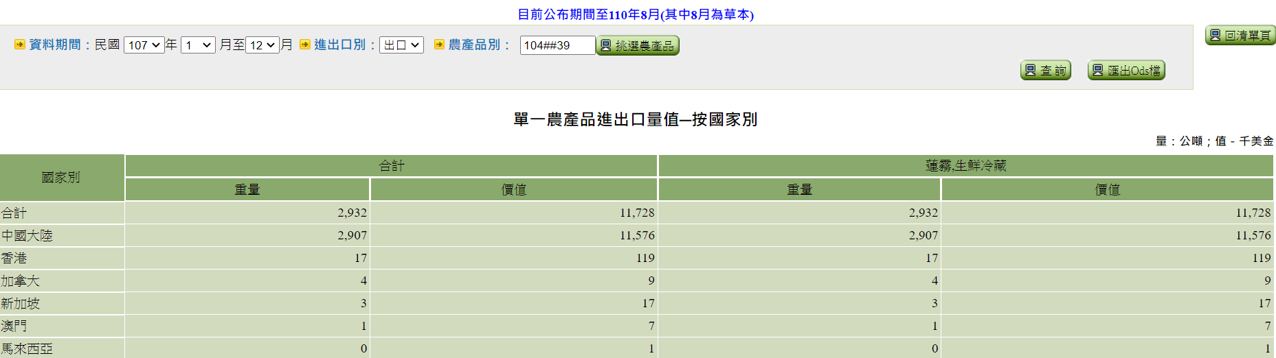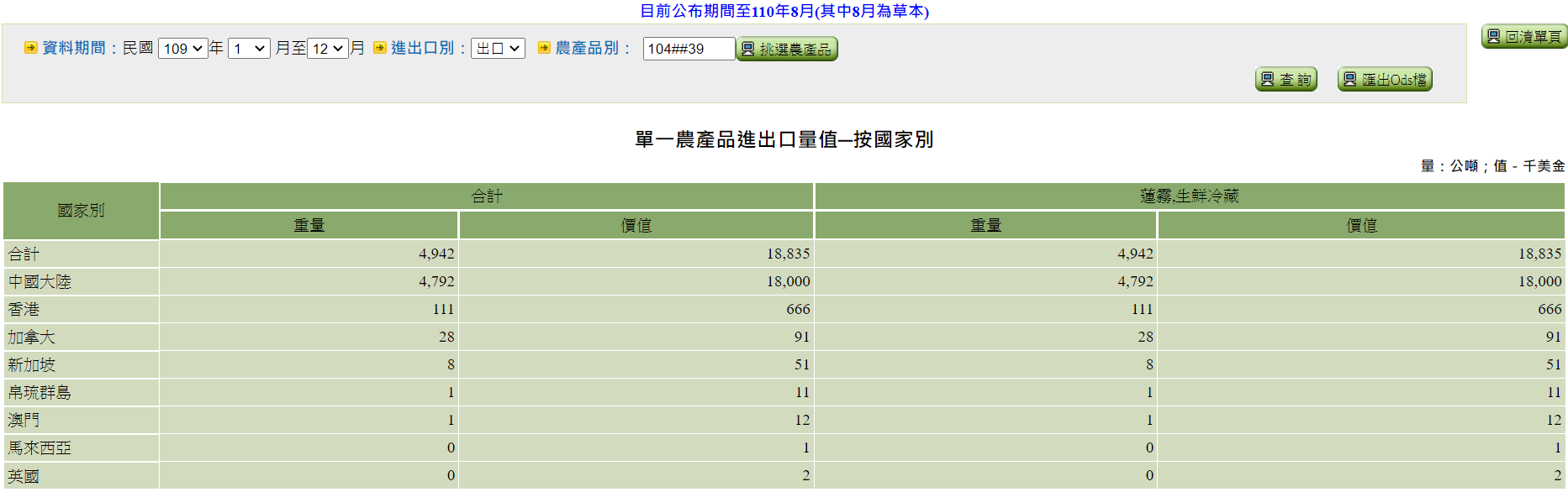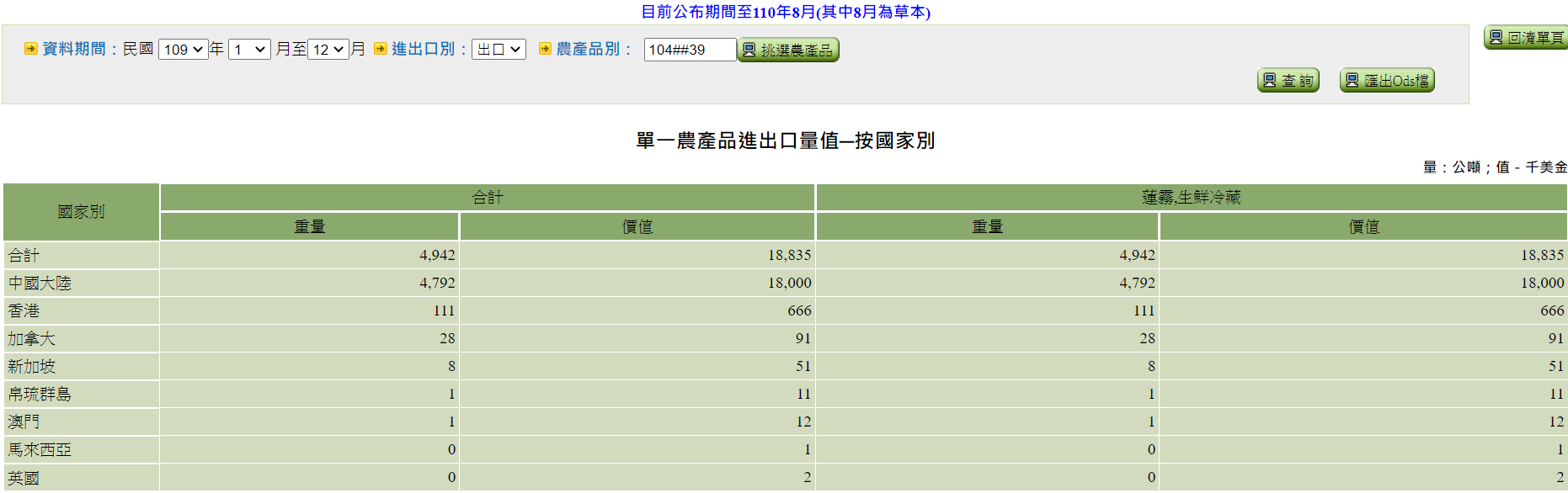 查核員透過行政院農業委員會網站進行農業統計資料查詢,點選單一農產品進出口量值─按國家別,以蓮霧為農產品別做查詢,資料期間為109年度(如圖一所示)和110年截至8月(其中8月為草本)止(如圖二所示),中國皆為台灣蓮霧的主要出口國,且出口量值達到九成以上(香港屬中國一部分),與潘孟安所述「屏東從不把蓮霧放在同一個籃子上」、農產外銷不能單壓同一市場的說法不相符。