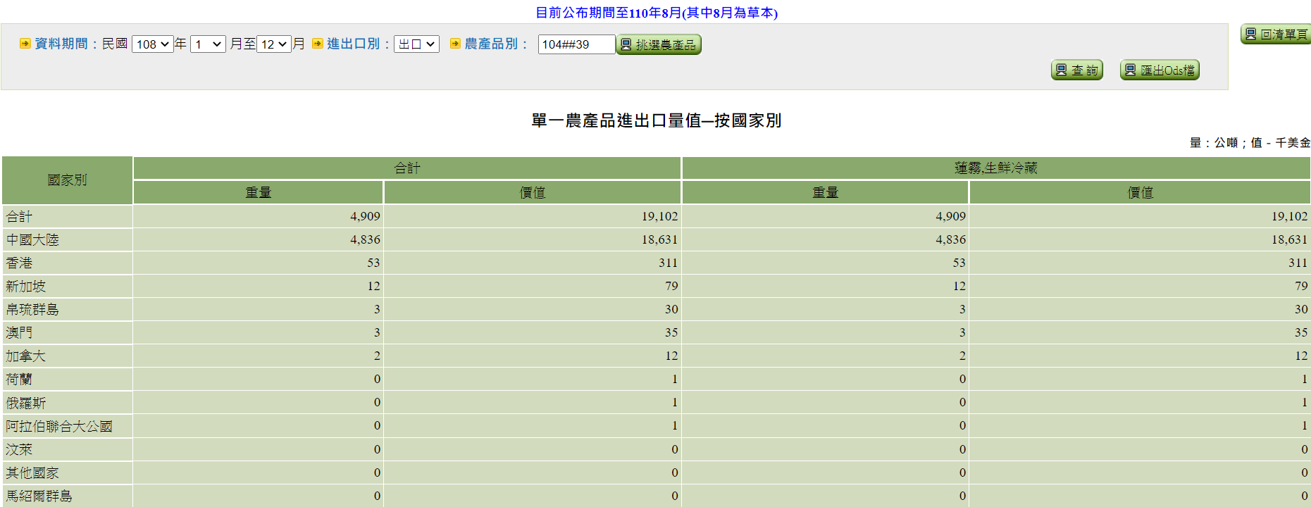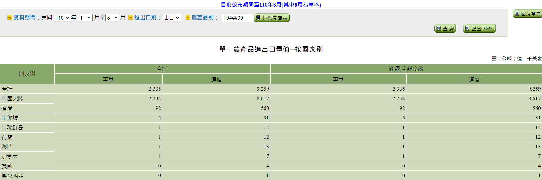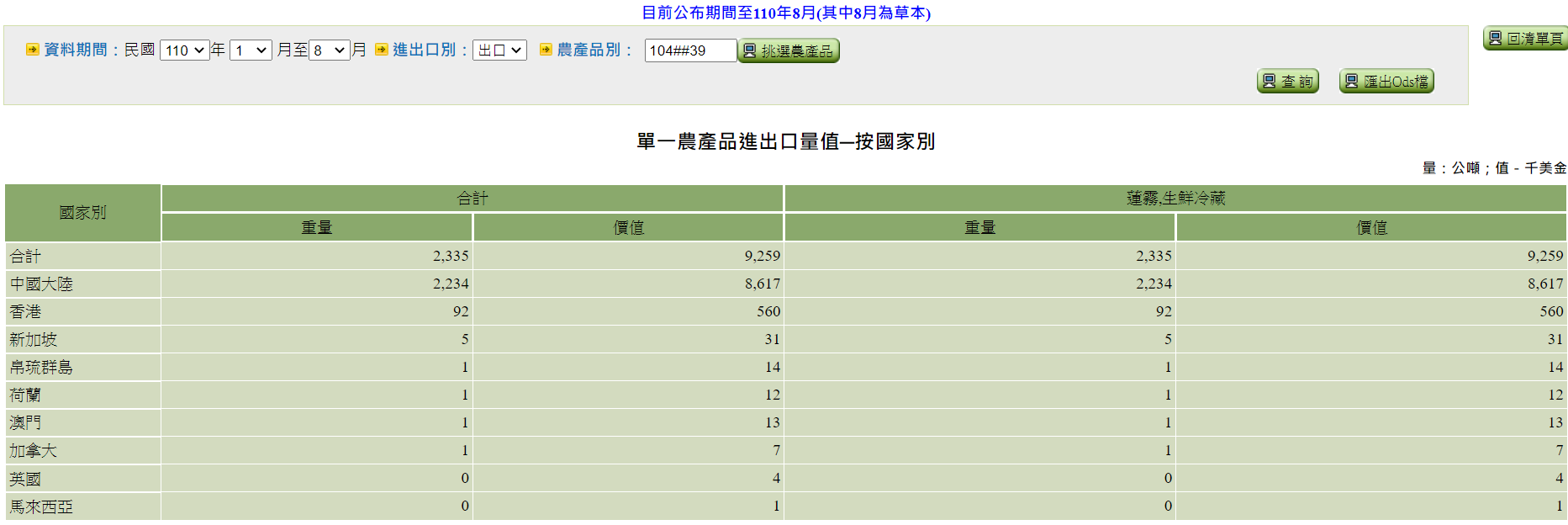查核員透過行政院農業委員會網站進行農業統計資料查詢,點選單一農產品進出口量值─按國家別,以蓮霧為農產品別做查詢,資料期間為109年度(如圖一所示)和110年截至8月(其中8月為草本)止(如圖二所示),中國皆為台灣蓮霧的主要出口國,且出口量值達到九成以上(香港屬中國一部分),與潘孟安所述「屏東從不把蓮霧放在同一個籃子上」、農產外銷不能單壓同一市場的說法不相符。
