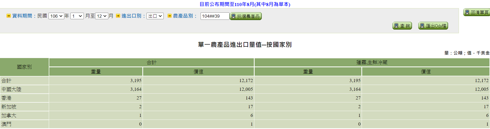 事實:為查核潘孟安所述的「多年前」就透過空運,讓蓮霧搭飛機前往加拿大華人超市,同步還有香港、澳門、越南以及新加坡等市場一說是否屬實,查核員於行政院農業委員會網站進行農業統計資料查詢,搜尋了自民國106年至民國110年8月的蓮霧出口統計資料,106年出口國家為:中國、香港、新加坡、加拿大、澳門(如圖一所示);107年出口國家為:中國、香港、加拿大、新加坡、澳門、馬來西亞(如圖二所示);108年出口國家為:中國、香港、新加坡、帛琉群島、澳門、加拿大、荷蘭、俄羅斯、阿拉伯聯合大公國、汶萊、馬紹爾群島(如圖三所示);109年出口國家為:中國、香港、加拿大、新加坡、帛琉群島、澳門、馬來西亞、英國(如圖四所示);110年出口國家為:中國、香港、新加坡、帛琉群島、荷蘭、澳門、加拿大、英國、馬來西亞(如圖五所示)。從以上出口國家統計,皆無出口越南市場的記錄,與潘孟安發文內容不相符。