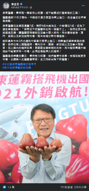 潘孟安表示,屏東蓮霧佔全國總產量7成,雖然9成內銷為主,外銷僅佔1成,但為了避免貿易風險,「屏東從不把蓮霧放在同一個籃子上」,我們在多年前就透過空運,讓蓮霧搭飛機前往加拿大華人超市,同步還有香港、澳門、越南以及新加坡等市場,每年持續分散市場風險。