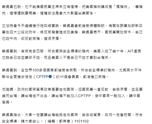 從前面兩個事實來看,美國退出CPTPP,新加坡也在加入之後兩年才開放含有克巴多胺的豬肉進口,明顯見將開放萊豬進口與否與美國或CPTTP同時掛起不是事實。