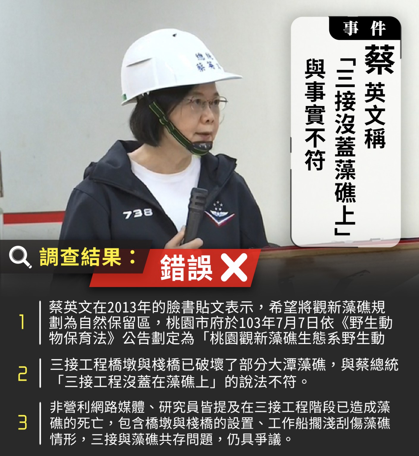 爭議點二:蔡英文說三接工程沒蓋在藻礁上,大潭藻礁也有保護?