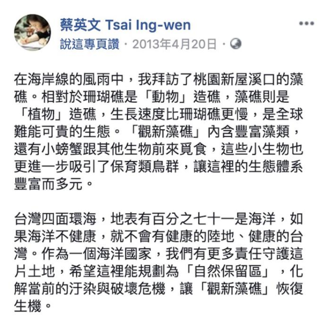 蔡總統在臉書發文表示今天實地從觀新藻礁、大潭藻礁,再來到桃園大潭電廠,是舊地重遊,很多人在網路上,會看到我八年前的照片,寫下藻礁永存,當時就是為了呼籲保護觀新藻礁,事實上,後來地方政府已劃定保護區,觀新藻礁已經保護下來了。三接工程沒蓋在藻礁上,觀新藻礁有保護,大潭藻礁也有保護,環境保護與國家發展可以雙贏。