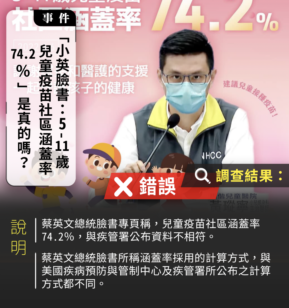 2. 總統蔡英文臉書稱,兒童疫苗涵蓋率74.2%,與疾管署公布資料不相符。
