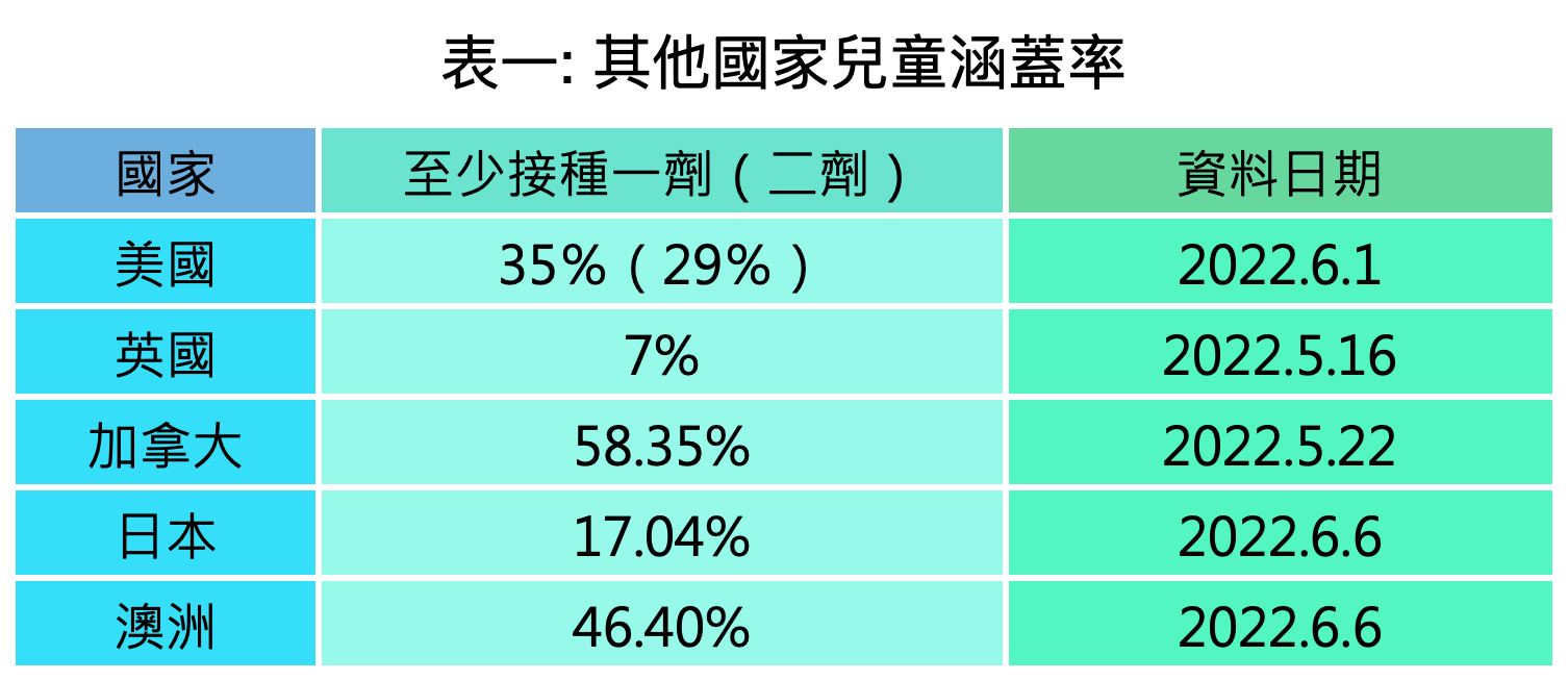 根據上表顯示,其他國家在兒童接種疫苗上,確實意願較低,在至少接種一劑疫苗的涵蓋率上低於台灣。但由於美國於2021年底就已開放5-11歲接種新冠肺炎疫苗,因此累積有29%的兒童已完整接種2劑疫苗。此外,美國CDC在5月20日建議,5至11歲兒童在完成施打2劑疫苗後,間隔至少5個月應施打追加劑。