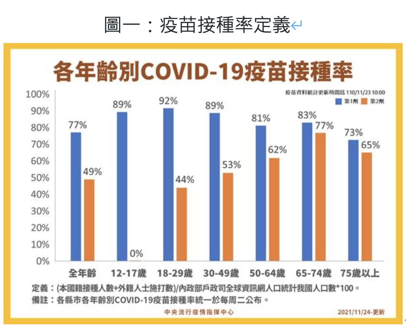 查詢疫苗涵蓋率的定義,美國疾病管制與預防中心將其界定為:「接種過疫苗人數佔人口之比例」。而根據我國指揮中心的定義,疫苗接種率為:「(本國籍接種人數+外籍人士施打數)/內政部戶政司全球資訊網人口統計我國人口數*100」。另外,針對指揮中心上述定義,在去年11月發生涵蓋率計算爭議時,指揮中心特別將此定義放進圖表中,如下圖一所示。