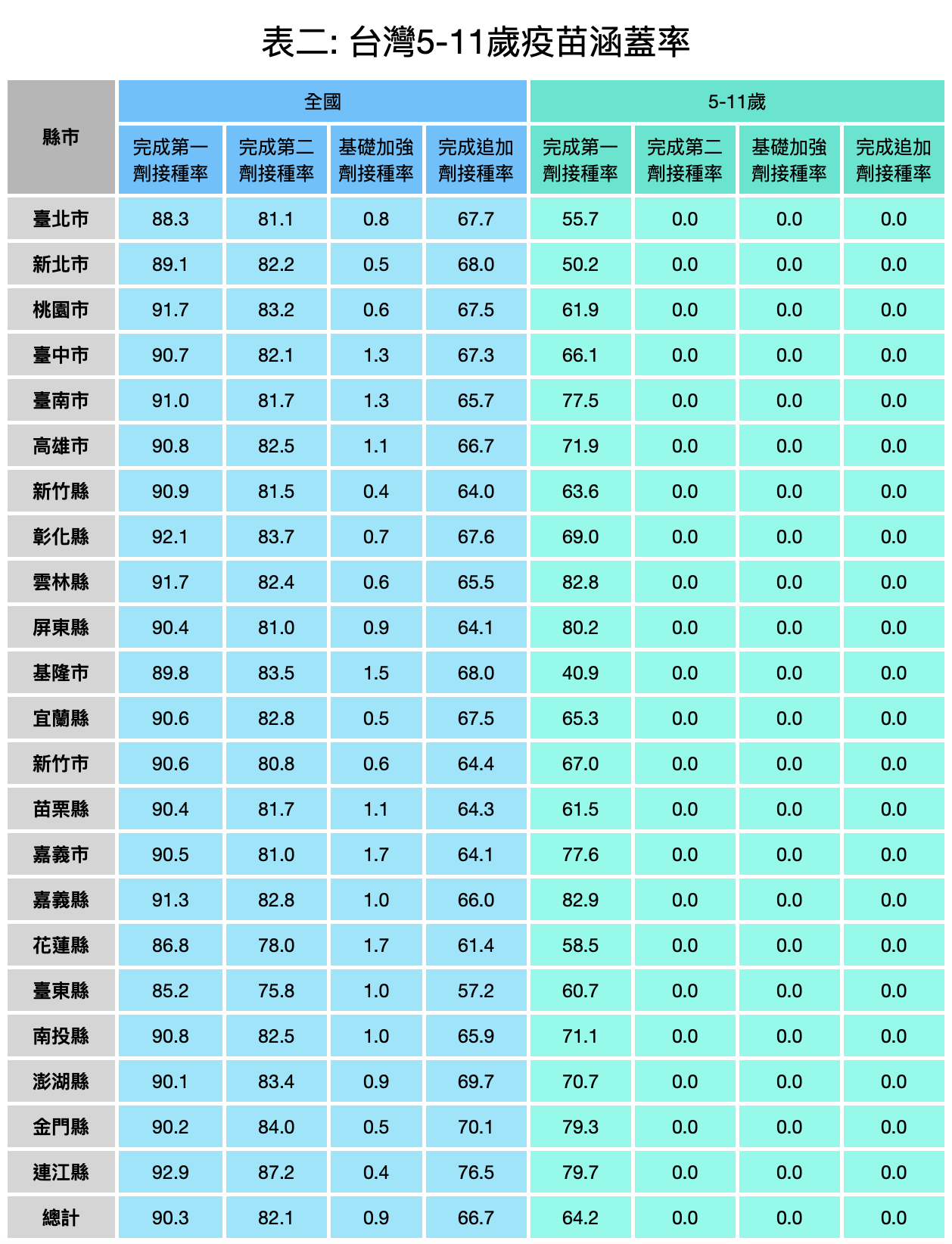 在5-11歲疫苗接種率上,根據衛福部疾管署公布之「1110606 COVID-19疫苗接種統計資料」,接種比例最高為雲林縣82.8%,最低為基隆市40.9%,全國平均則為64.2%,如下表二。