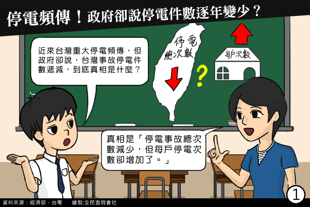 2022.07.18 停電頻傳!政府卻說停電件數逐年變少? 議題解碼室 撰稿人 / 全民查假會社 2022.07.18 小 中 大 停電頻傳 台電 停電件數 每戶停電 圖解漫畫 梁啟源 資料來源 內容來源:經濟部、台電 圖片繪製:全民查假會社 聯絡我們
