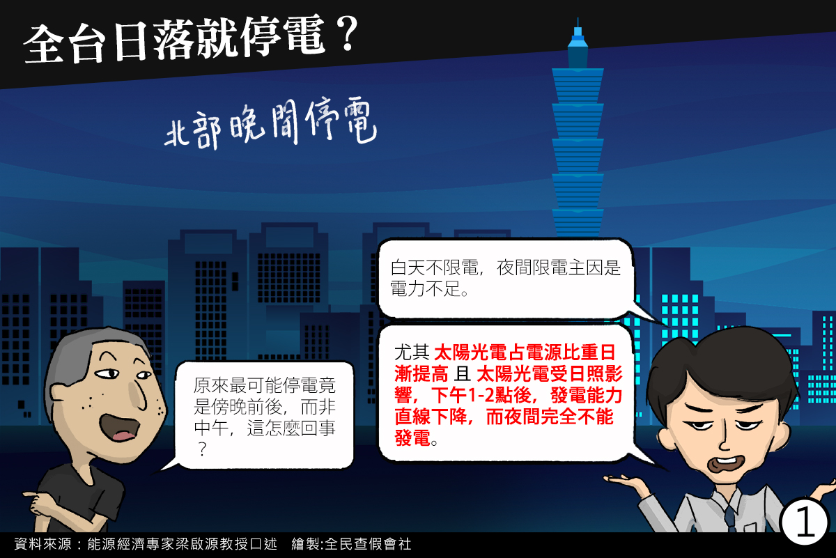 2022.08.01 全台日落就停電? 議題解碼室 撰稿人 / 全民查假會社 2022.08.01 小 中 大 梁啟源 太陽光電 水力發電 風力發電 備轉容量 日落停電 資料來源 內容口述:中央大學管理講座教授、能源經濟專家梁啟源 文字採訪:蘇元和 圖片繪製:全民查假會社 聯絡我們